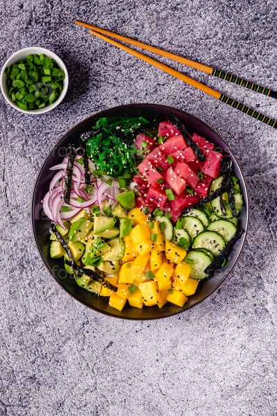 Гавайская поке из тунца с водорослями, авокадо, манго, огурцом