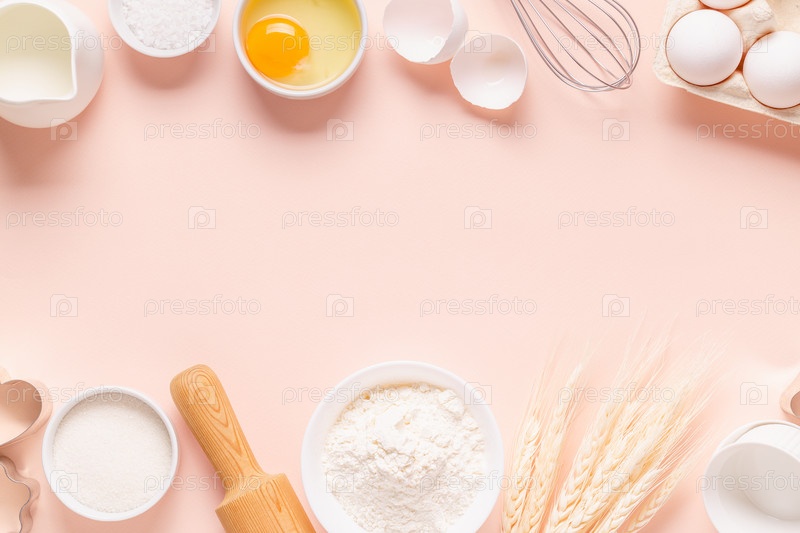 Ингредиенты для выпечки на светло-розовом фоне