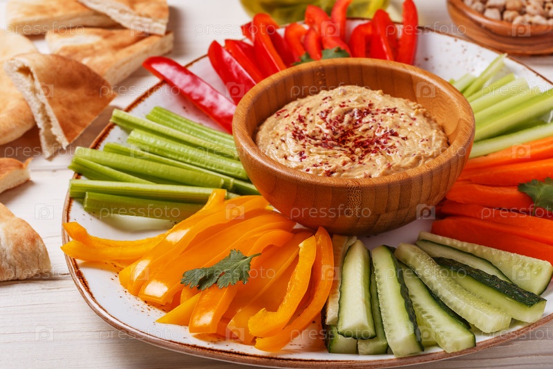 Домашний хумус с ассорти из свежих овощей и лавашом