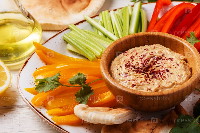 Домашний хумус с ассорти из свежих овощей и лавашом