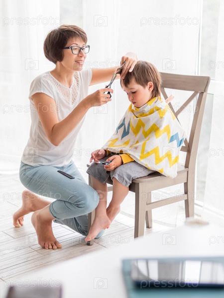 Мать сама подстригает сына. Маленький мальчик сидит, покрытый тканью, и держит ножницы. Семейная жизнь