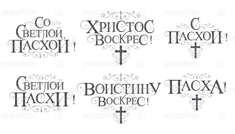 Векторная иллюстрация. Набор надписей на русском языке к православной Пасхе. Векторный дизайн православной пасхальной типографии для поздравительных открыток и плакатов. Русский перевод: Со светлой Пасхой