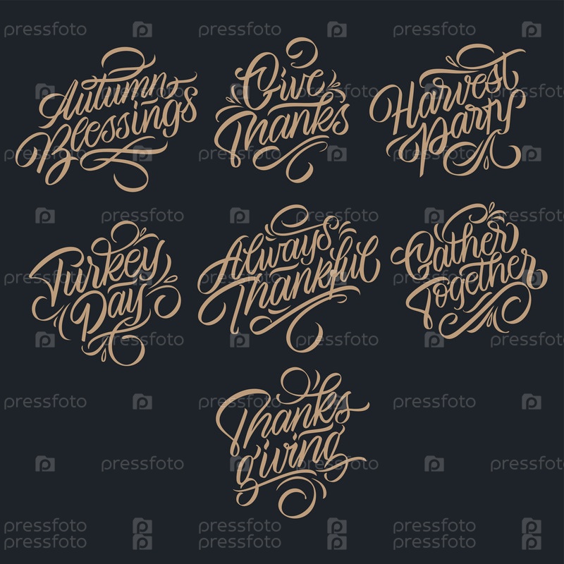 Наклейки на День благодарения. Рукописные надписи. Векторный текст. Наклейка, плакат, логотип. Празднование шаблона дизайна