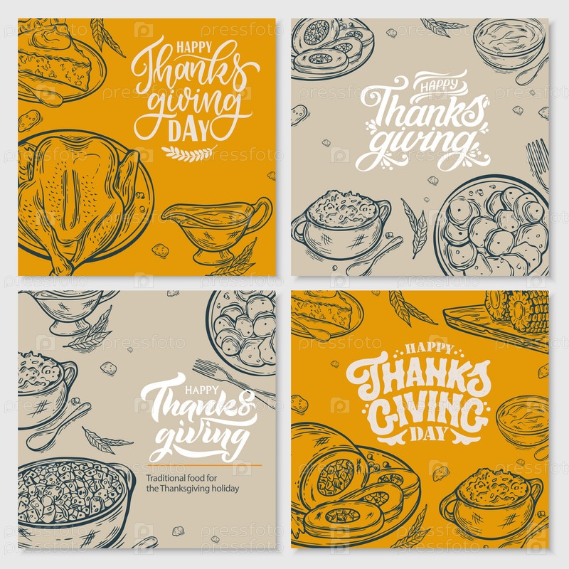 Векторная иллюстрация. Еда благодарения. Иллюстрации для меню в кафе, ресторанах, наклейки. Рукописные надписи
