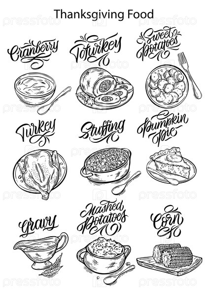 Векторная иллюстрация. Еда благодарения. Иллюстрации для меню в кафе, ресторанах, наклейки. Рукописные надписи