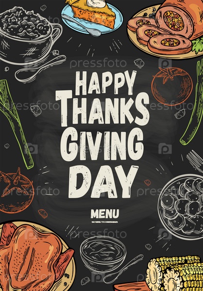 Векторная иллюстрация. Счастливое меню Дня благодарения. Меню можно использовать в барах, кафе, ресторанах. Празднование шаблона дизайна