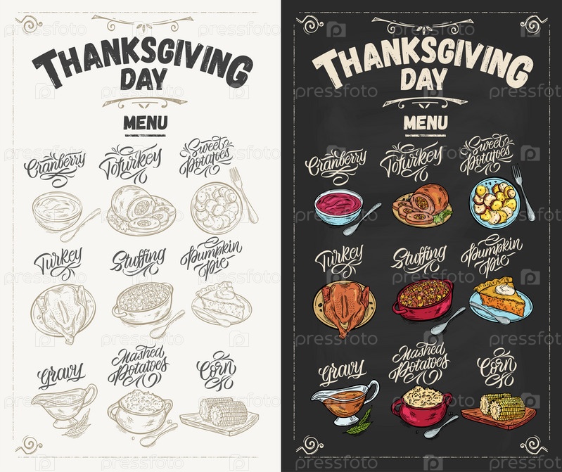 Векторная иллюстрация. Еда благодарения. Иллюстрации для меню в кафе, ресторанах, наклейки. Рукописные надписи