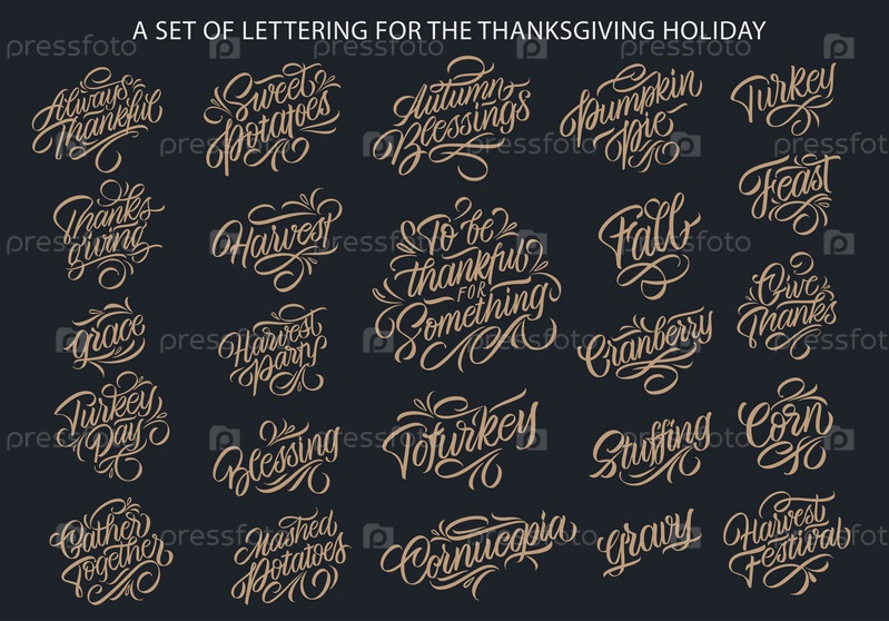 Набор надписей к празднику благодарения. Наклейки на День благодарения. Рукописные надписи. Векторный текст. Наклейка, плакат, логотип. Празднование шаблона дизайна