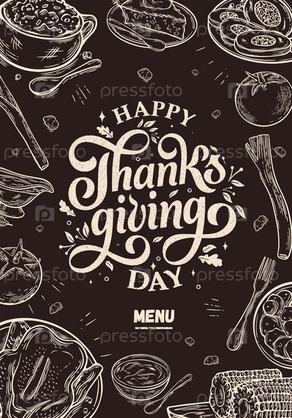 Векторная иллюстрация. Счастливое меню Дня благодарения. Меню можно использовать в барах, кафе, ресторанах. Празднование шаблона дизайна