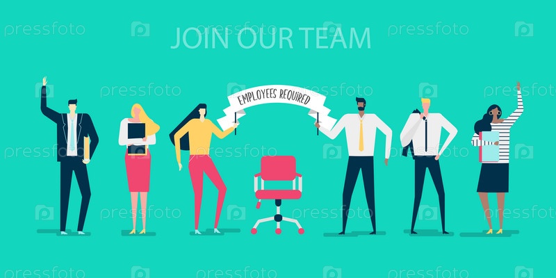 Векторная иллюстрация. Присоединиться к нашей команде. Мужчины и женщины разных национальностей в офисе приветствуют нового сотрудника. Держит плакат с надписью «Требуются сотрудники». Плоский дизайн., векторные иллюстрации. Присоединиться к нашей команде