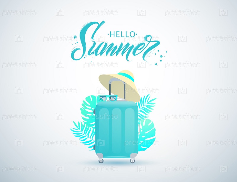 Векторная иллюстрация. Привет лето рукописные надписи. Синий дорожный чемодан с соломенной шляпой и солнцезащитными очками. Листья тропических растений. Плоский дизайн
