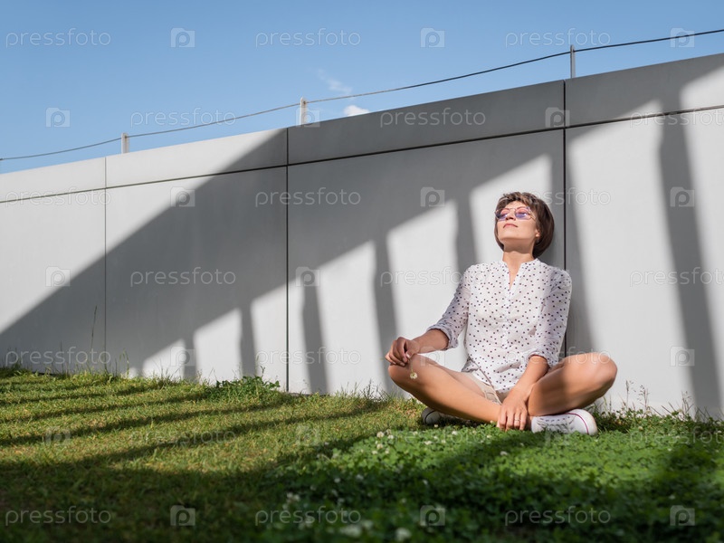 Внимательная женщина медитирует на лужайке в городском парке. Природа в городе. Отдохните на свежем воздухе после работы. Летние вибрации