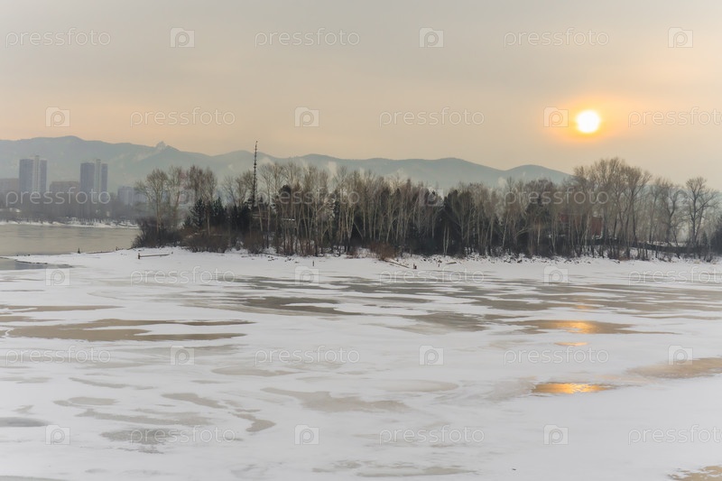 Морознай вечер над Енисеем в центре Красноярск