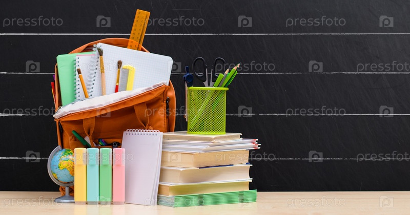 Рюкзак, полный школьных принадлежностей, стоит в классе рядом с черной доской. Пустое свободное место для письма на школьной доске