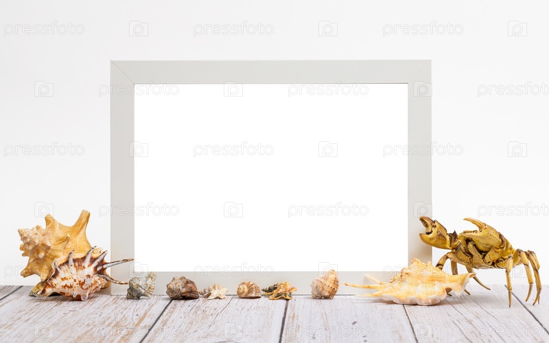 Белая фоторамка с икрой ракушек на белом фоне. Белая фоторамка на столе. Пустое пустое пространство для текста или фотографий