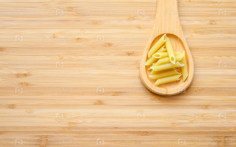 Деревянная ложка с макаронами лежит на деревянной доске. Слева от ложки есть пустое место для текста. Концепция рецепта приготовления пасты