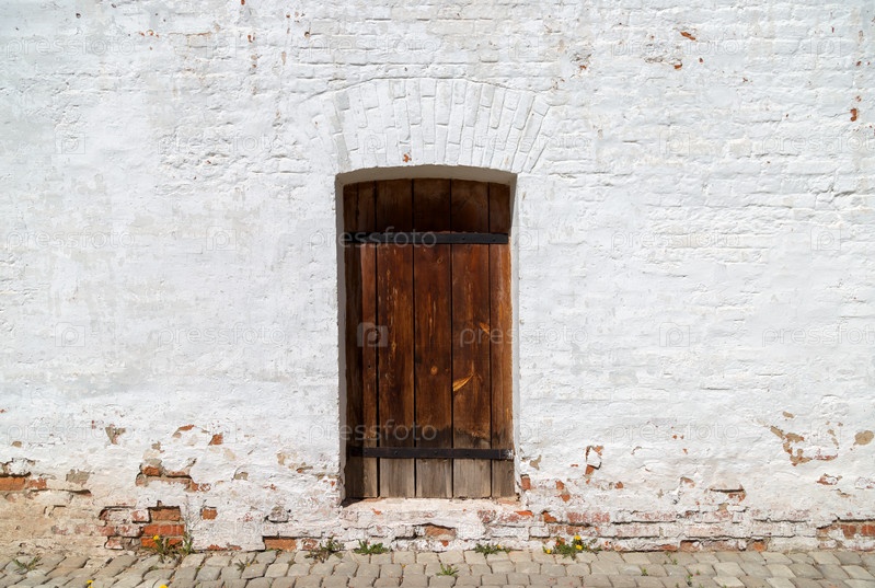 Старая деревянная дверь в белой кирпичной стене