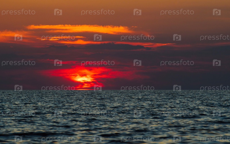 Яркий красный закат над поверхностью моря. Красота природы
