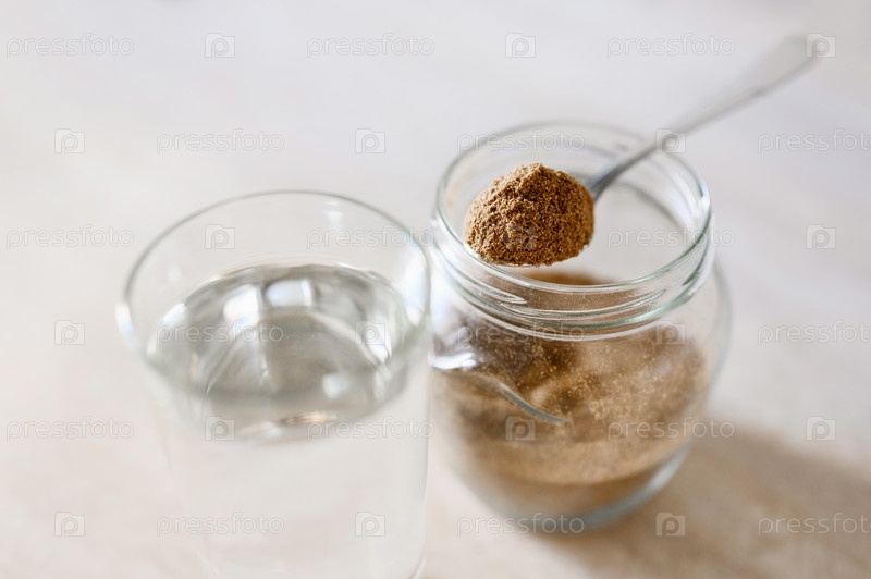 Вид сверху на пищевую травяную добавку в ложке рядом со стаканом чистой воды. Селективный акцент на пищевой добавке. Концепция здорового питания