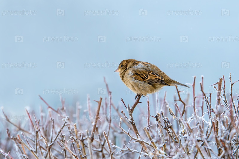 Маленький воробей на кончике ветки в очень сильный мороз. Ветки покрыты инеем. Портрет воробья в зимний день