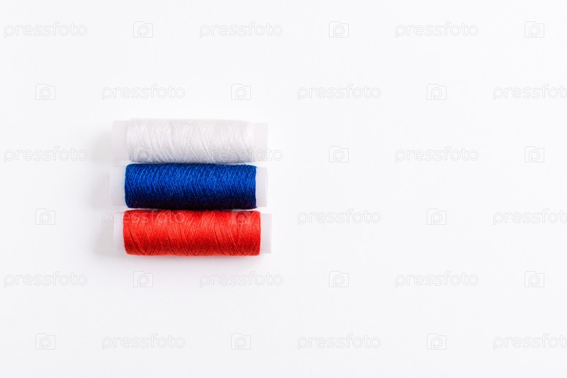 Три катушки ниток для шитья сложены в виде флага России на белом фоне. Концепция русского патриотизма и швейная промышленность страны. Есть свободное пустое место