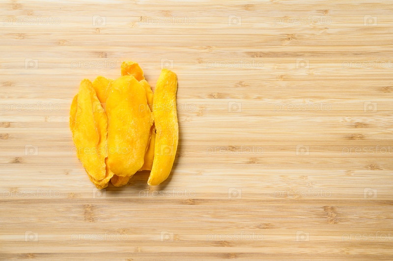 Сушеные ломтики манго на деревянной доске. Свободное пустое место справа