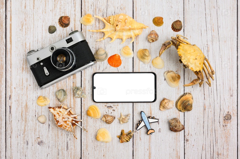 Ракушки, краб, старая камера и фигурка самолета на деревянном столе. В центре — смартфон с пустым белым дисплеем. Концепция путешествий и туризма