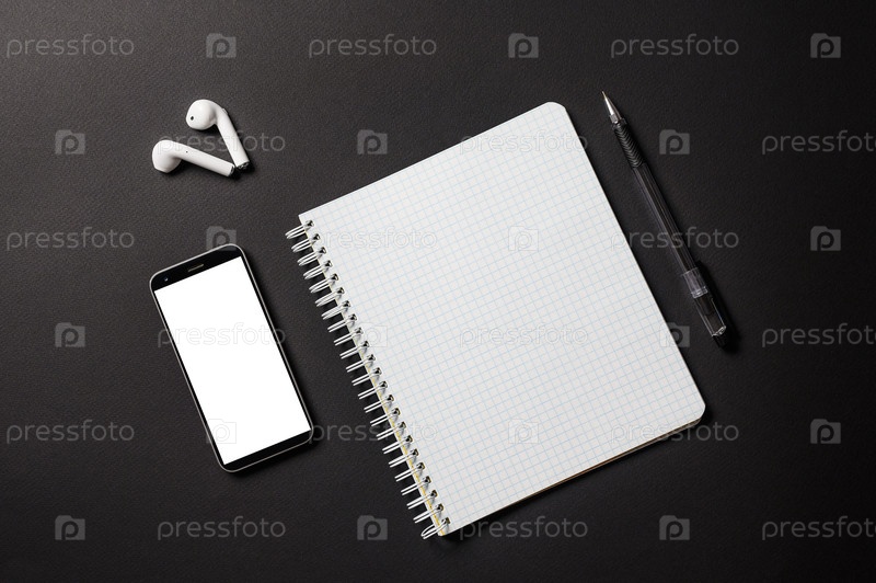 Предметы для бизнес-конференции или онлайн-урока на черном фоне. Предметы укладываются по диагонали. Откройте блокнот, ручку и смартфон с пустым белым дисплеем для вашей рекламы. Вид сверху