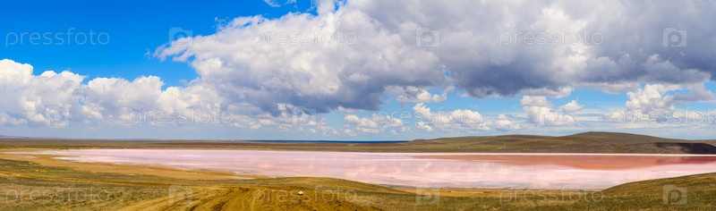 Широкая панорама. Вид на розовое озеро. Густые облака над озером