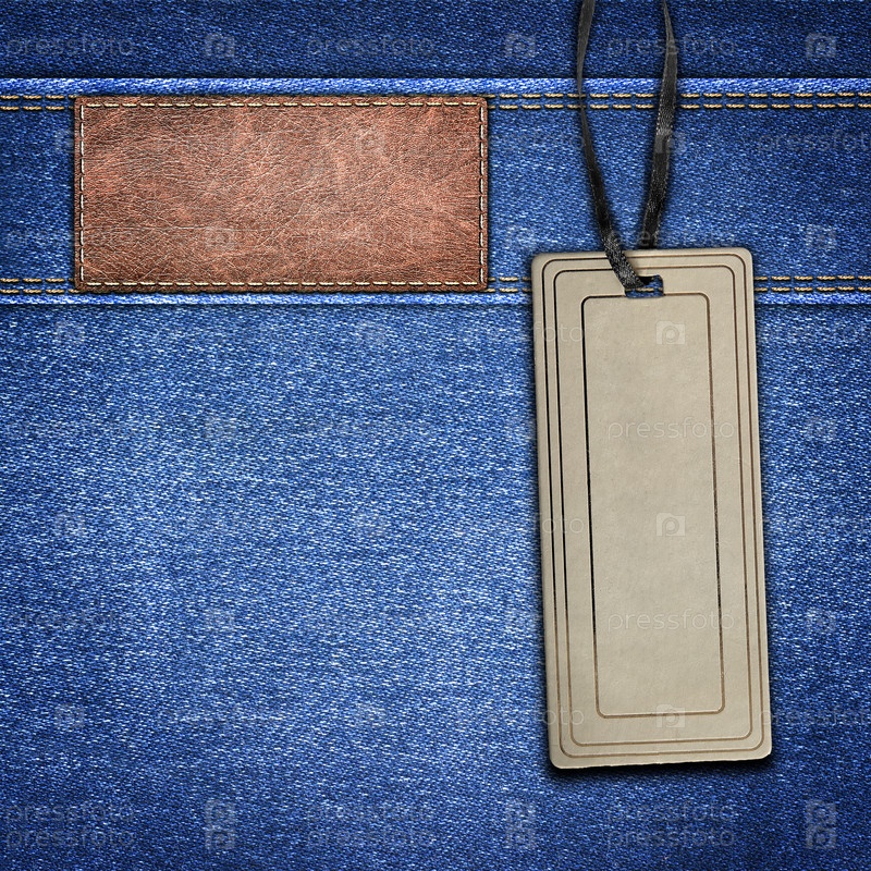 Фон простая джинсовая ткань с кожаной этикеткой и ценником крупным планом