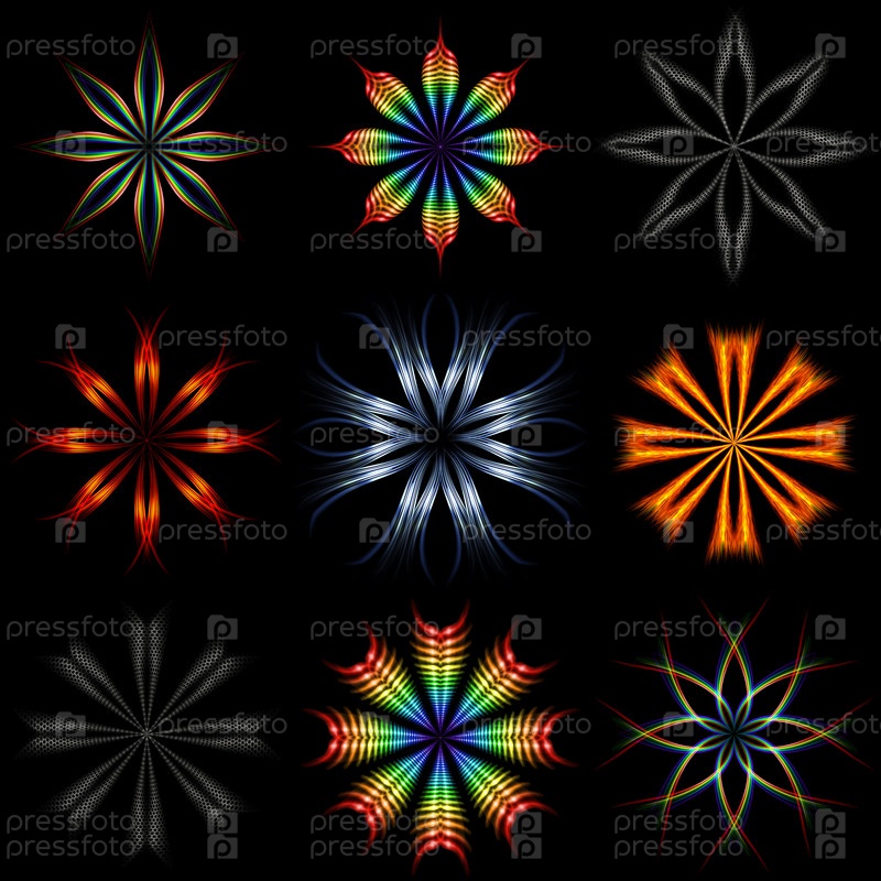 Набор элементов дизайна восьмиконечной звезды из красочных светящихся линий на черном