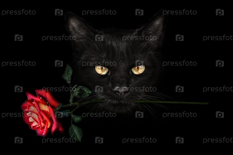 Крупным планом портрет черного кота с желтыми глазами и красной розой в зубах
