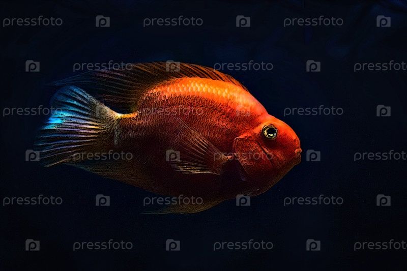 Иллюстрация аквариумных рыбок красный попугай на темно-синем фоне