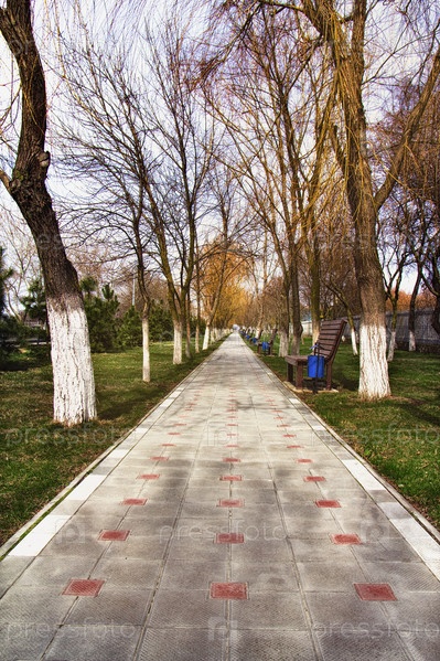 Пешеходная дорожка посреди аллеи деревьев весной