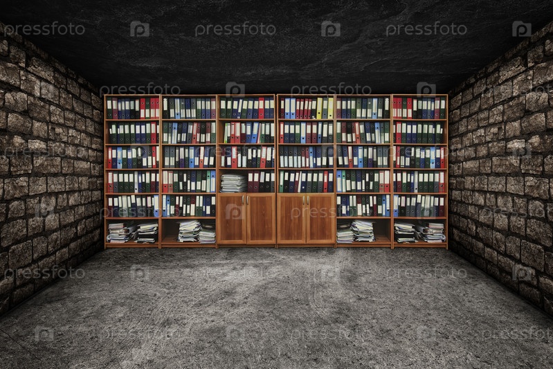 3D-иллюстрация деревянных стеллажей с учетными файлами в папках для хранения в винтажной каменной комнате