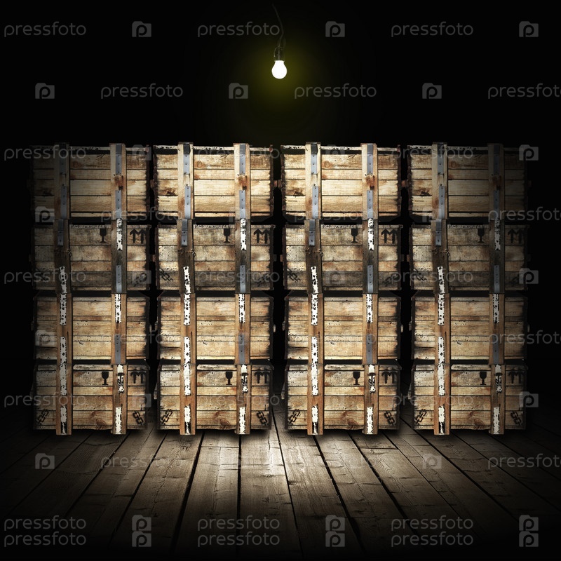 Стопки деревянных ящиков, освещенных лампой накаливания