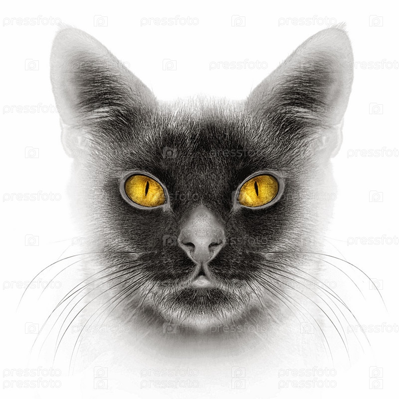 Портрет кота с желтыми глазами крупным планом анфас на черном фоне