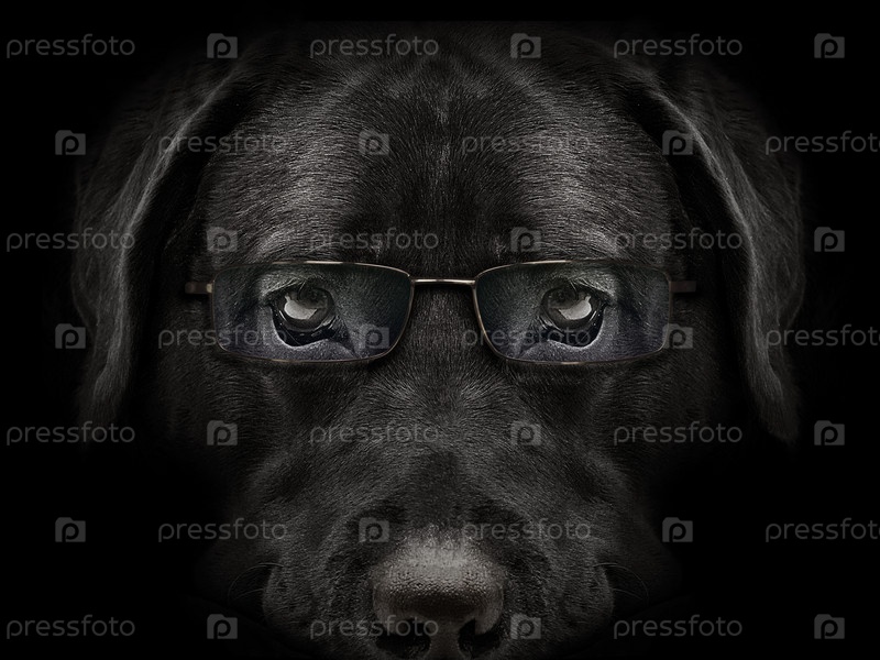 Лабрадор с темной мордой в очках крупным планом. передний план
