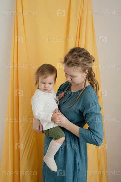 Мать с дредами с ребенком на руках, на желтом фоне ткани. Крупный план
