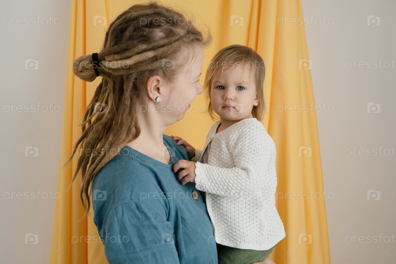 Мать с дредами с ребенком на руках, на желтом фоне ткани. Крупный план