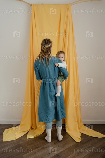 Мать с дредами с ребенком на руках, на желтом фоне ткани. Вертикальное фото в полный рост