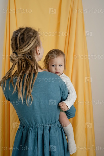 Мать с дредами с ребенком на руках, на желтом фоне ткани. Крупный план