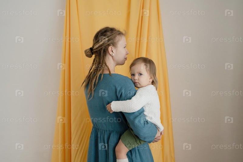 Мать с дредами с ребенком на руках, на желтом фоне ткани. Крупный план