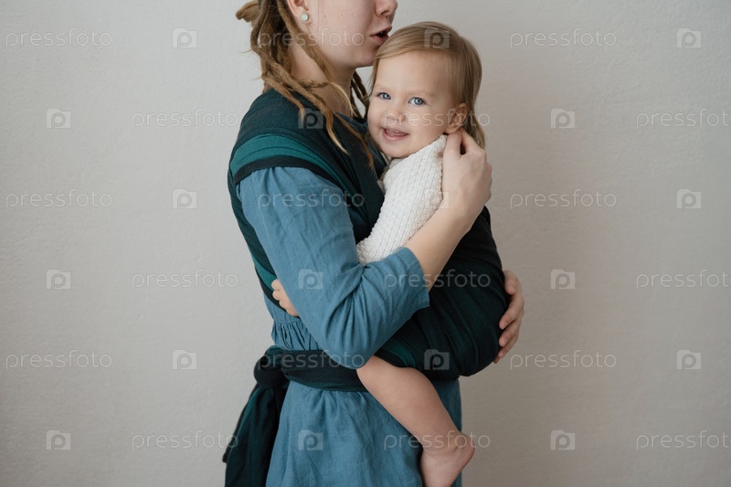 Мама в слинге со счастливой дочерью для удобства материнства и заботы о ребенке. Современная мама выбирает комфорт