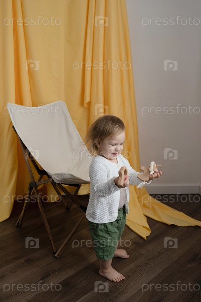Маленькая девочка играет с деревянной игрушкой в гостиной