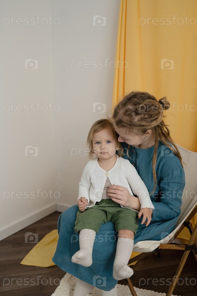 Мать и дочь сидят на шезлонге в комнате с желтыми шторами
