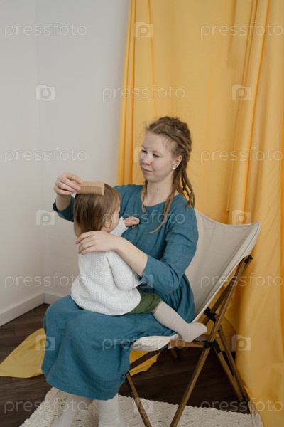Мать с дредами заботится о ребенке, расчесывает волосы на голове деревянной расческой. Желтый фон и складной стул