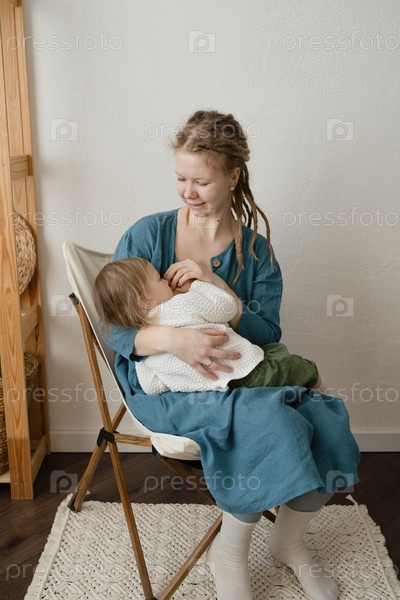 Кормить грудью. Мать с дредами и младенец сидят в комнате. Забота о детях и материнстве