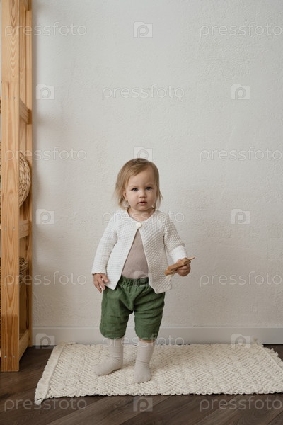 Ребенок стоит и держит в руках деревянную игрушку. Портрет милой маленькой девочки на белом фоне
