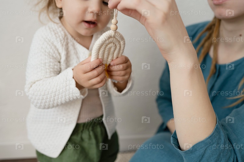 Мама и дочь смотрят на радугу. Крупный план игрушки макраме ручной работы